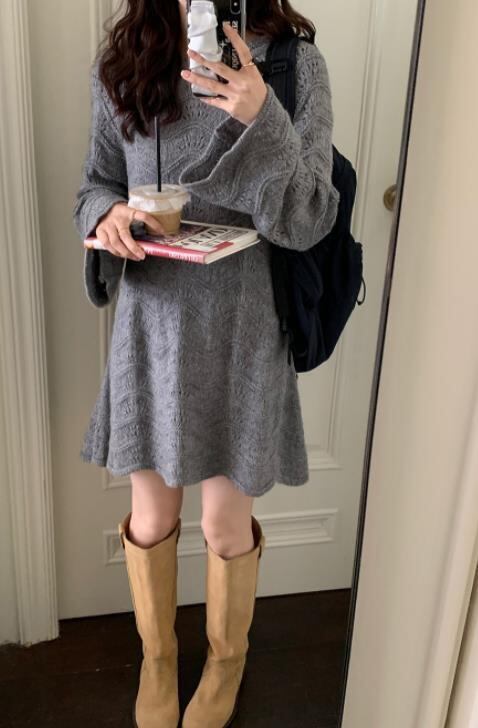 【2色】ラウンドネック ナチュラルシルエット 長袖ニットワンピース ドレス