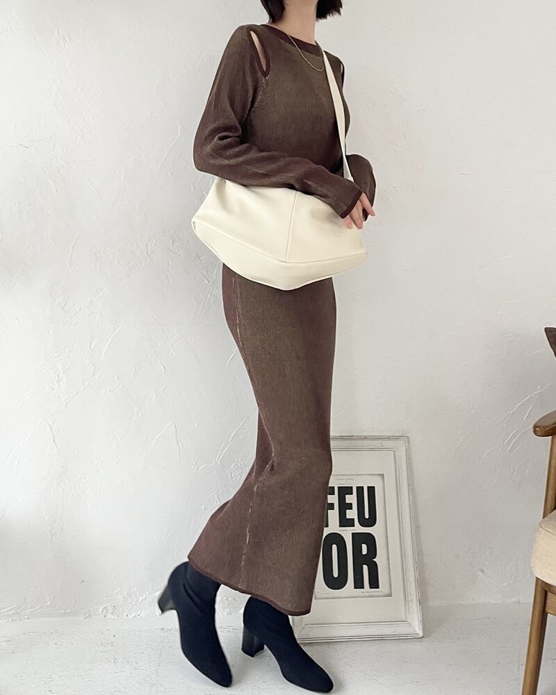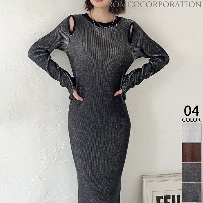 新作 春物 全4色 配色ショルダーカットアウトニットワンピース