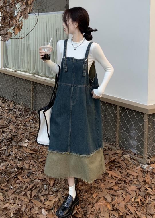 【ロンTセット】秋冬新作 女 レディース 袖なしデニム サロペットスカート ロング ワンピース 台型スカート