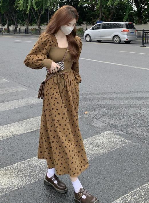 秋冬新作 女 レディース ハイウエスト 長袖 花柄 ロング ワンピース 台型スカート S-3XL