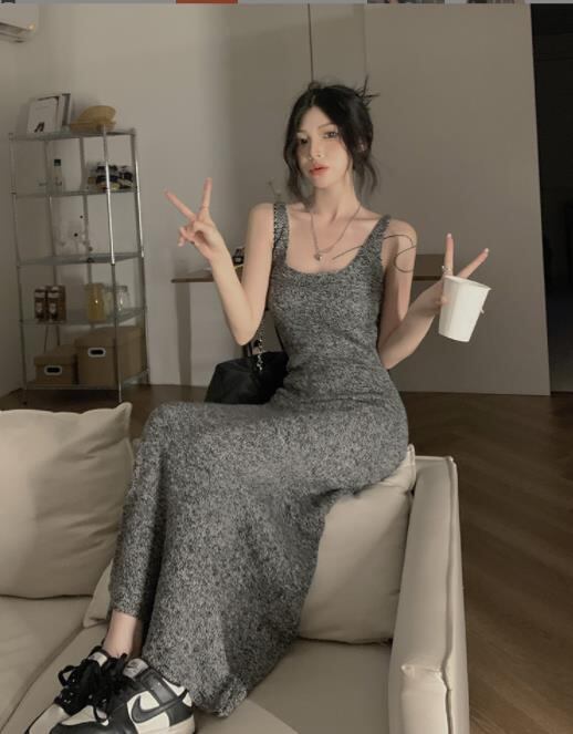 秋冬新作 女 レディース ハイウエスト 袖なし ニット 吊りスカート ロング ワンピース