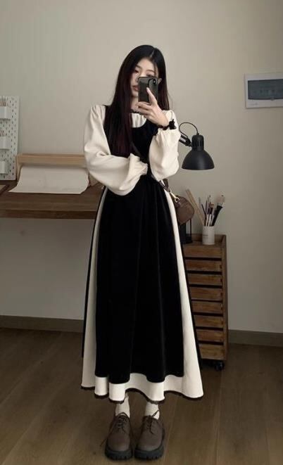 秋冬新作 女 レディース ハイウエスト 長袖 ロング ワンピース ドレス 台型スカート セット