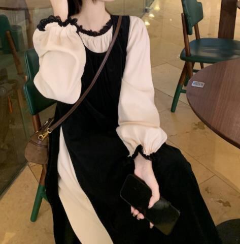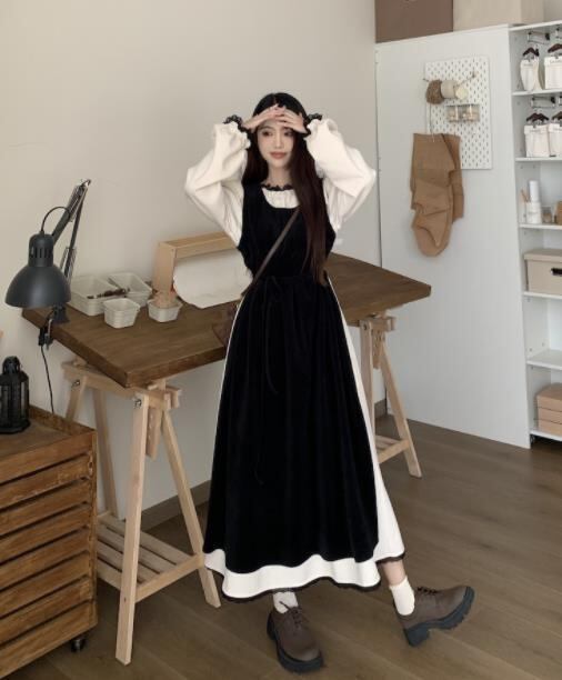 【ジレセット】秋冬新作 女 レディース ハイウエスト 長袖 ロング ワンピース ドレス 台型スカート