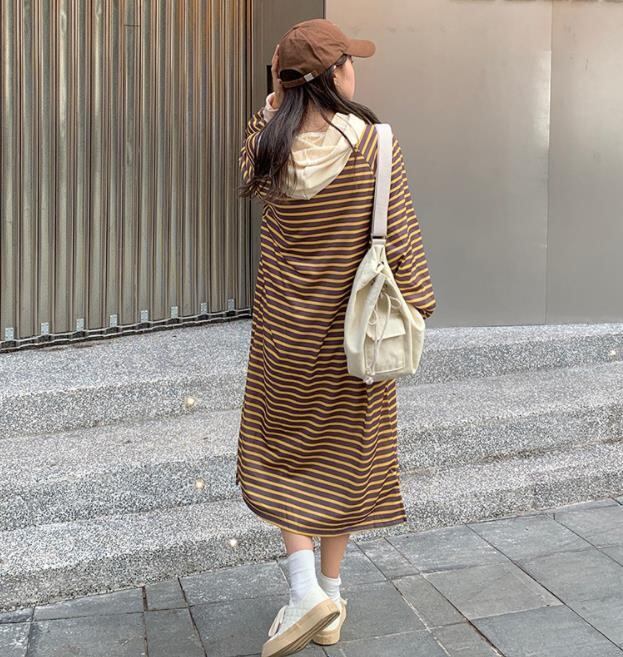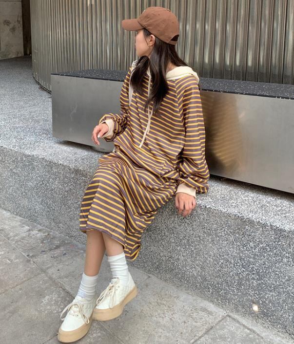 【2色展開】秋冬新作 女 レディース ハイウエスト 長袖 厚手 帽子付け スウェット ロング ワンピース 台型スカート