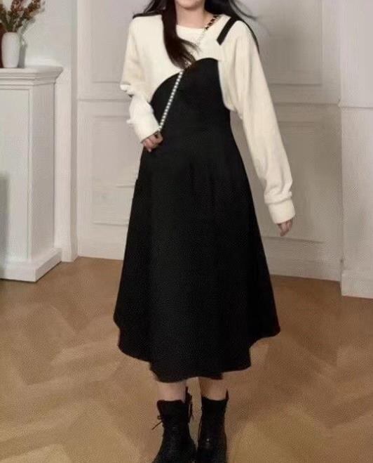 秋冬新作 女 レディース 袖なし 吊りスカート ロング ワンピース+ トップス 2点セット