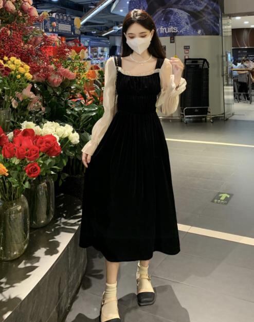 秋冬新作 女 レディース ハイウエスト 長袖 ロング ワンピース 台型スカート M/L